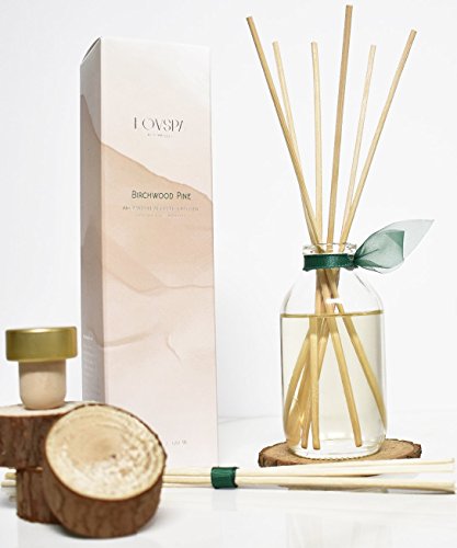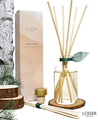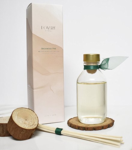 PRIME DEAL! Winter Birchwood Pine Reed Diffuser Set by LOVSPA with Wood Slice Coaster | White Pine, Fir Balsam, Birchwood & Amber Fragrance Notes | Woodsy Rustic Decor w/Scented Sticks