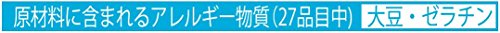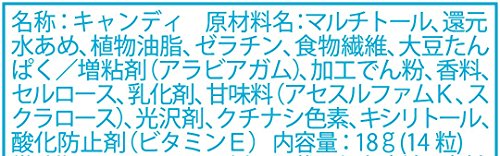 原材料:マルチトール、還元水あめ、植物油脂、ゼラチン、食物繊維、大豆たんぱく/増粘剤(アラビアガム)、加工でん粉、香料、セルロース、乳化剤、甘味料(アセスルファムK、スクラロース)、光沢剤、クチナシ色素、キシリトール、酸化防止剤(ビタミンE)