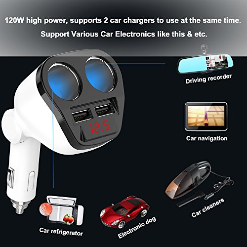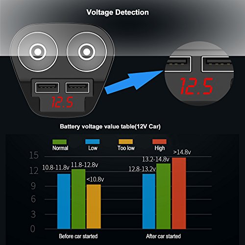-. Feature : Multifunction: Come with 2 cigarette sockets and 2 usb chager ports. Convert and increase your car/vehicle cigarette lighter from 1 splitter to 2 plug sockets. Supports multiple mobile phones, tablets, and electronic products at the same time. / Widely Compatible: Applicable to a variety of car models like excavators, cranes, large trucks, small truck, , commercial vehicles, cars, etc. / Safe to Use: Your car battery voltage could be show by the digital LED display. This product comes with voltage monitor and Intelligent Protection System, can effectively prevent overcharge, overvoltage, overheating, overcurrent, overload, short circuit. There is also intelligent explosion protection here, protect your life safety at any time. This also support anti-interference function, and it can not affect the signal of other electronic devices in the car. / 3.4A Dual USB Port: 2 USB charging ports with Max 5V/3.4A output, compatible for iPhone, iPod, iPad, tablet, Samsung Galaxy, HTC, ect. / After-sale Service: 24-month warranty and friendly customer service.