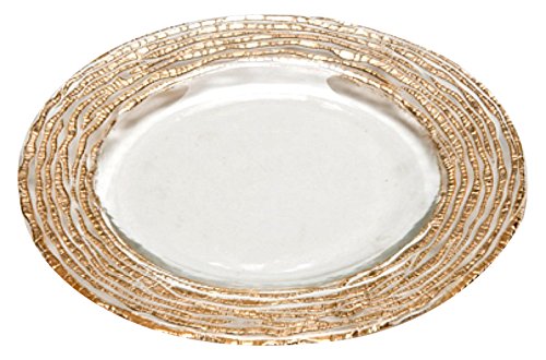 - Inspired by the organic tree bark like texture, there is a gold leaf around the rim of the plate, while the center is clear glass