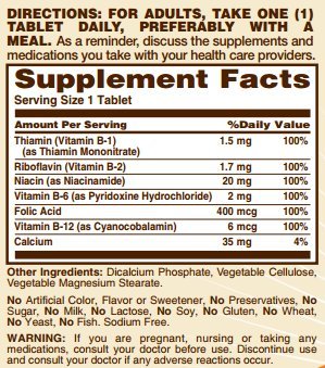 Multi-Vitamin Supplement. 100% recommended daily value. Vegetarian formula. Promotes energy metabolism. Smart Facts: A balanced complex of B vitamins promotes healthy nerve function and energy metabolism. In addition, the combination of Vitamin B-6 and B-12, plus Folic Acid promote heart health. Folic Acid is also important for women of childbearing age. B vitamins are water soluble and require regular replenishment. No artificial color, flavor or sweetener, no preservatives, no sugar, no milk, no lactose, no soy, no gluten, no wheat, no yeast, no fish. Sodium free. Guaranteed quality. Laboratory tested. Visit us at www.sundownnaturals.com. Please recycle. (These statements have not been evaluated by the Food and Drug Administration. This product is not intended to diagnose, treat, cure or prevent any disease.)Feature