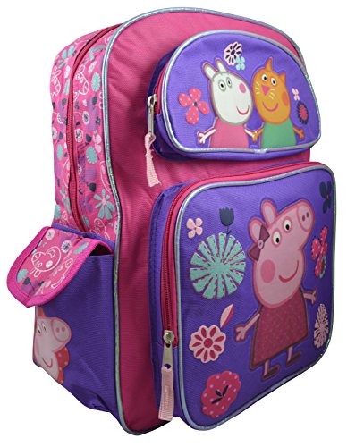 -. Brand : Peppa Pig -. Color : Pink -. Department : girls -. EAN : 0708325405011 -. Feature : Brilliant colors for dazzling effect on Peppa Pig / Sparkly design! perfect for school and vacations! Well known character that your child will love having with them. The perfect set all year round! / Features one Main Compartment, Two front pocket and Two side mesh Pockets. Backpack Dimensions (in inches): 16 x 12 x 5 / Made of an easy to clean and very durable 100% polyester -. PackageQuantity : 1 -. ProductGroup : Apparel -. ProductTypeName : LAGE -. Size : Large -. Title : Peppa Pig Girls' Large Deluxe 16" Backpack w/ Stamping Bookbag -. UPC : 708325405011