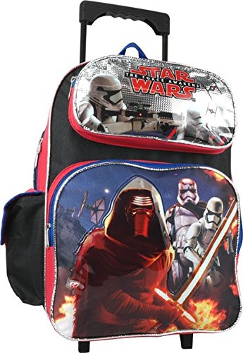 -. Brand : Disney -. Color : blue red black -. Department : boys -. EAN : 0875598663810 -. Feature : Double zippered main compartment. / One side vecro-closure pocket and one side meshed pocket. / Two Front pockets with zipper closure. / Adjustable padded shoulder straps / Measures around : 16"H x 12"W x 5"D -. PackageQuantity : 1 -. ProductGroup : Apparel -. ProductTypeName : LAGE -. Title : Disney Star Wars the Force Awakens Large 16" Rolling Backpack -. UPC : 875598663810