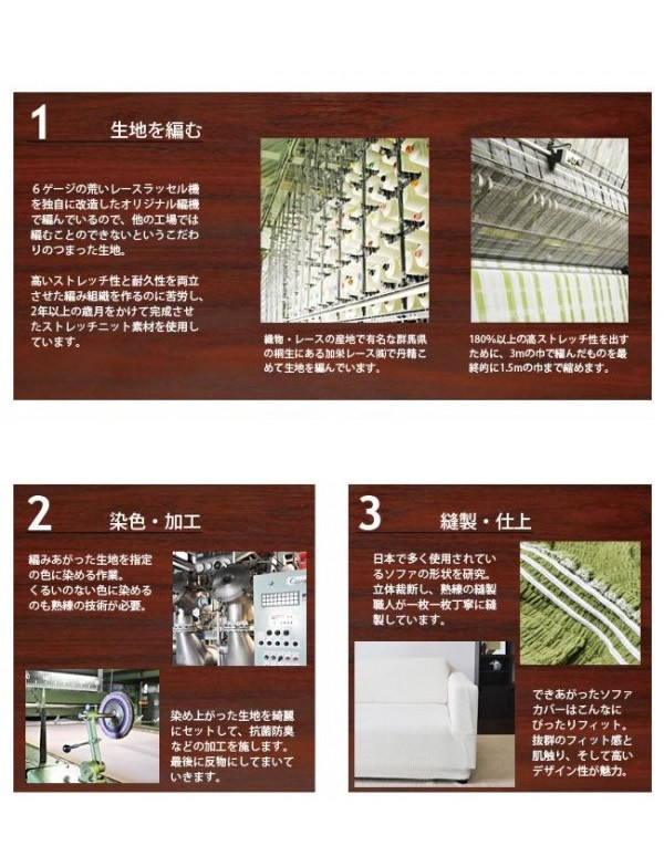 | 縦横自在に伸びて、ソファにぴったりフィットするソファカバー。ストレッチ性を極限まで高めたスーパーストレッチニット生地を使用。女性一人でも簡単に着脱ができる手軽さも魅力です。SEKマーク取得の抗菌防臭加工も施し、いつでも快適に愛用できます。ベーシックなカラーリングと挿し色を含めた6色展開。お部屋のイメージに合ったカラーをお選びください。日本製。 |