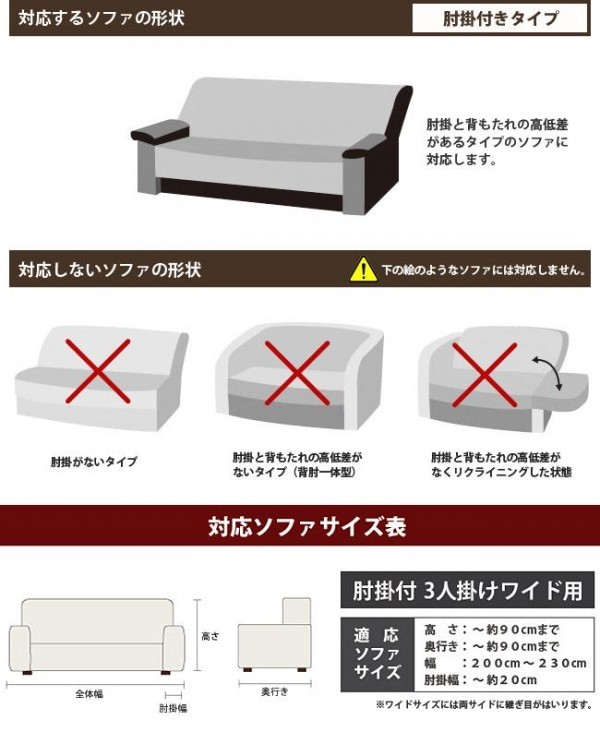| 仕様 | 抗菌防臭加工(SEKマーク取得) ウォッシャブル(洗濯機洗い可能・ネット使用) 【適応ソファーサイズ】 高さ:~約90cmまで 奥行き:~約90cmまで 幅:200~230cm 肘掛幅:~約20cm ※ワイドサイズには両サイドに継ぎ目が入ります。 |