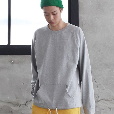 STRING POCKET T-SHIRTS [COLOR] MELANGE GRAY [SIZE/단면 cm] M: 어깨~소매 82/ 가슴 60/ 총장 74 L: 어깨~소매 85/ 가슴 64/ 총장 76 [FABRIC] COTTON 100% [DESCRIPTION] 포인트 컬러의 스트링이 들어간 루즈핏의 긴팔 티셔츠. 캥거루 포켓으로 캐주얼한 느낌을 더함. [MODEL SIZE] 188cm / 72kg / L사이즈 착용