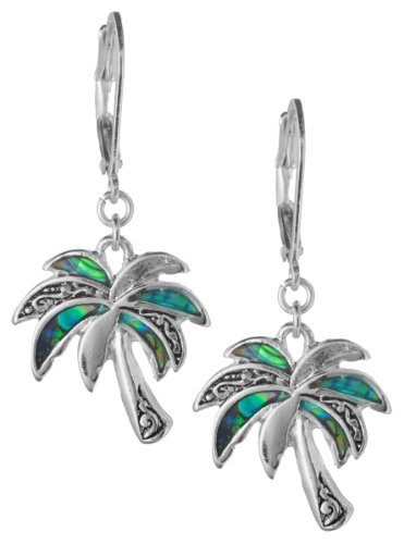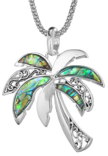 -. Title : Green Abalone Palm Tree with Filigree Pattern in a Silver-tone Popcorn Chain & Earrings