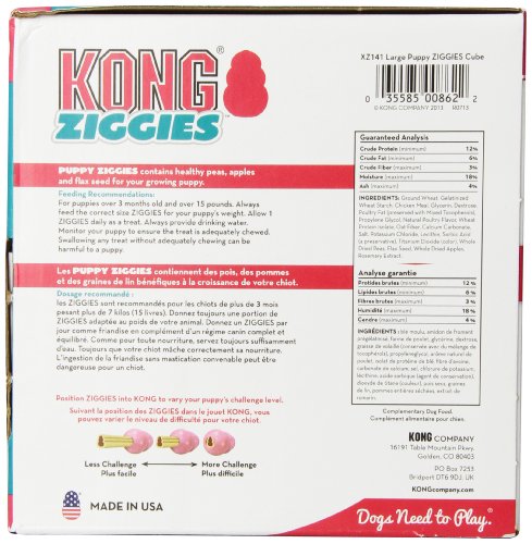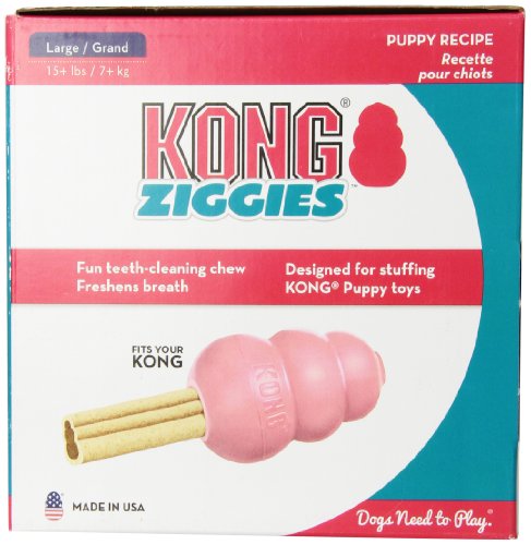 -. Binding : Misc. -. Brand : KONG -. EAN : 0035585008622 -. Feature : Perfect For Use With The Kong Puppy, Puppy Binkies, Or Puppy Activity Ball / Freshens Breath And Cleans Teeth / Easy to digest / Made In The Use / Use With Medium/Large Puppy Kong; Suitable For Puppies 15-Pound And Larger -. Label : KONG -. Manufacturer : KONG -. Model : XZ141 -. MPN : XZ141 -. PackageQuantity : 1 -. PartNumber : XZ141 -. ProductGroup : Pet Products -. ProductTypeName : PET_SUPPLIES -. Publisher : KONG -. Size : Large -. Studio : KONG -. Title : KONG Puppy Stuff'N Ziggies Cube Large Dog Treat, 62.7-Ounce, 40-Pack -. UPC : 035585008622 -. Warranty : Warranty against manufacturer defects