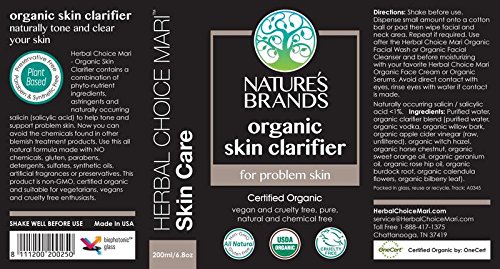 Since 1995 Natures Brand's Herbal Choice Mari line has been offering consumers the very best facial cleansers with the highest quality ingredients. This organic facial clarifier is Certified USDA Organic. It is a pure and natural astringent formulated to help blemished skin. This herbal facial toner leaves your skin wonderfully nourished without feeling dry. Whenever you wash your face with any facial wash your skin needs to have its pH restored with ingredients that are in harmony with your body rather than with chemicals made in a lab. The combination of these plant ingredients along with the distilled vodka help relieve skin itchiness and irritation. NO GLYCOLIC ACID is used as this ingredient has been classified as a skin irritant according to THE SCIENTIFIC COMMITTEE ON COSMETIC PRODUCTS AND NON-FOOD PRODUCTS INTENDED FOR CONSUMERS and has even been banned in Canada. Never added "Fragrance". Beware of products that contain fragrance; The word "fragrance" or "parfum" on the product label signifies an undisclosed mixture of various scent chemicals and ingredients used as fragrance dispersants such as diethyl phthalate. There is strong evidence that fragrance is a human immune toxicant and allergen. This is a pure and natural face toner that works in harmony with your skin. Avoid the potentially toxic ingredients found in many facial toner products and give your skin a safe all natural alternative that is 100% chemical free and synthetic preservative free to tone and balance the pH level of your normal to oily skin. See organic certification at http://www.naturesbrands.com/natures-brands-NOP-certified-organic-certificate.pdf. Use together with Herbal Choice Mari Organic Facial Wash for All Skin Types, including sensitive skin (see item # B00M9K2B92) and Organic Skin Repair Serum for Normal to Oily Skin (see item # B0088Q1OV2) along with this Organic Clarifier.Feature
