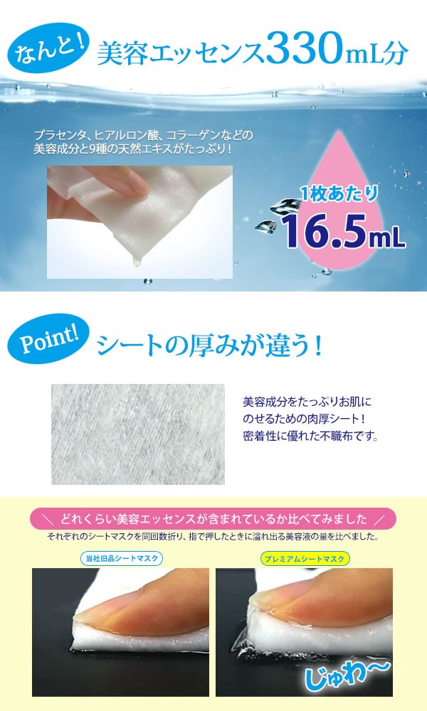 | プラセンタ、ヒアルロン酸、コラーゲンの3種の美容成分と9種の天然エキスが潤いとハリのある健康的な素肌へと導きます。 極厚シートでしっかり密着・保湿します。 |