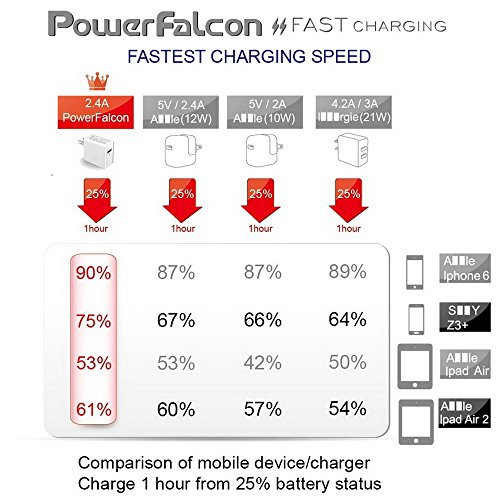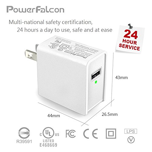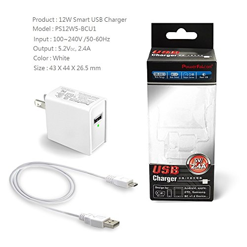 PowerFalcon 12W (5V/2.4A, UL Certified) Travel Wall Charger (White), Builtin Smart IC to detect Android and Apple devices + 80cm Micro-USB Cable (for android device)