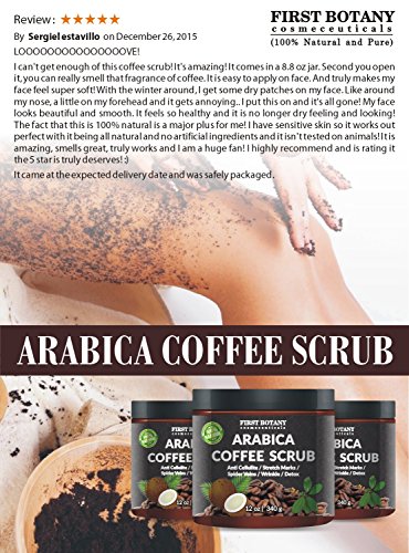 -. Feature : LOADED WITH ANTI-OXIDANTS: Our Coffee Body Scrub is loaded with antioxidants, which help to fight premature skin aging like wrinkles, sun spots, and fine lines. When applied under and around the eyes, it can help in minimizing the appearance of puffy eyes as caffeine restricts blood vessels, which reduces swelling and inflammation. It can also help lightens dark circles under the eyes. / 100% NATURAL EXFOLIATING SCRUB: Exfoliate your skin improves circulation & help remove residual dirt, giving you a fresher, younger, more moisturized appearance. Coffee grounds in this scrub acts as a mechanical exfoliate that helps to scrub away dead skin to reveal the new, healthy skin underneath and as a chemical exfoliater removing skin cells with enzymes or acidic properties. / BUY NOW WITH 100% SATISFACTION GUARANTEE : Purchase with complete peace of mind, we endorse our products to be of the highest quality and most effective in the market. Our Coffee Scrub will provide your skin a more glowing and radiant appearance upon 1st use. If you are not completely satisfied with the product, we will refund your entire purchase. / GET RID OF CELLULITE: We combine best quality organic coffee grounds with moisturizing, skin-soothing organic coconut oil and dead sea salt for an extra exfoliating kick. By massaging our organic anti cellulite coffee body scrub onto any problem area, you'll stimulate blood flow resulting in smoother, firmer skin. Caffeine is the #1 enemy of Cellulite, which tightens and provides antioxidants to the skin when applied topically. When applied religiously, it has been shown to reduce the appearance of cellulite. / CACAO COCONUT SHEA BUTTER SUGAR BODY SCRUBS FORMULA: This high caffeine formula specializes in targeting stretch marks removal, and cellulite while boosting your skins anti-oxidants. Our coffee body scrub skin care routine may help in preventing varicose veins. The caffeine in a coffee scrub acts as a vascular restrictor, shrinking blood vessels and reducing the appearance of varicose veins. This scrub also helps to lighten the scars and tighten the skin. It is very effective for stretch mark removal process.