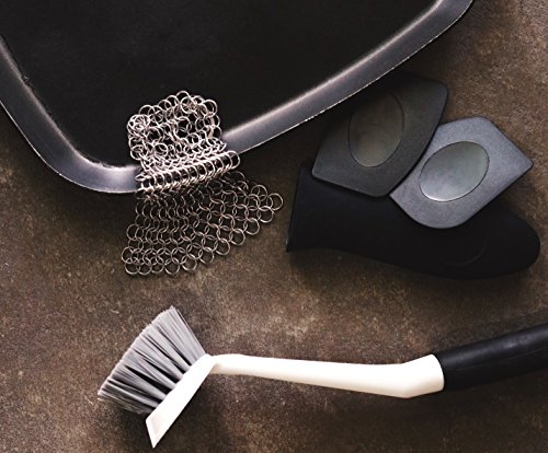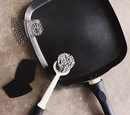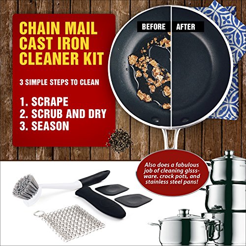 -. Feature : ★ 5 PERFECT ASSORTMENT KITCHEN ESSENTIALS - BEST VALUE: You will get 5 quality cleaning items that includes: Scrub Brush, 2 Pan Scrapers, Silicone Pan Handle and Cast Iron Cleaner Net ( 6"x6" ) perfect for cleaning your cast irons, pans and pots / ★ BEST VALUE TO YOU: You will be getting an amazing 5 items so it gives you choice and flexibility when cleaning and keeping your cast iron, pans or pots super clean / ★ KEEP YOUR HANDS SAFE & DO NOT BURN YOURSELF ANY MORE: Quality silicon well-made handle to protect your hands from heat, burn and hot pans and pots / ★ TOUGH ON BURNT-ON-MESS & ANNOYING HARD TO REACH CURVES/CORNERS: The brush has well-made bristles are firm to clean your cast iron/pans/pots without scratching. 2 Pan Scrapers will do a wonderful job to scrap stubborn residence and gets everything off. / ★ STAINLESS STEEL CHAINMAIL MESH NET: The highest food grade steel in the industry. Our chain mesh scrubber is very well-made, durable long-lasting construction. The cast iron cleaning mesh is also dish washer friendly. Ideal for camping and camping cookware