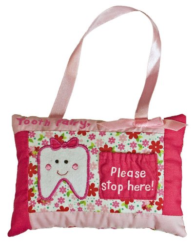 -. Feature : Your child will look forward to a visit from the Tooth Fairy as soon as she gets a "wiggler". / This delightful Tooth Fairy Pillow puts an end to your stealth attempt to retrieve a tooth from under a child's pillow in the dark of the night. / Simply hang the Tooth Fairy Pillow on a door knob or bed post and make an easy exchange--the tooth for a little reward! / Dimensions: 6 1/2" wide x 9" high (including ribbon) / Fabric pattern scale may vary slightly depending upon availability.