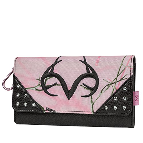 LADIES HUNTING WALLET CLUTCH - A pink camo wallet with the Realtree logo features a snap closure, 11 credit card pockets, 1 large slip pockets, 1 interior Picture / ID, accordion pockets, internal zippered pocket and external zippered pocket