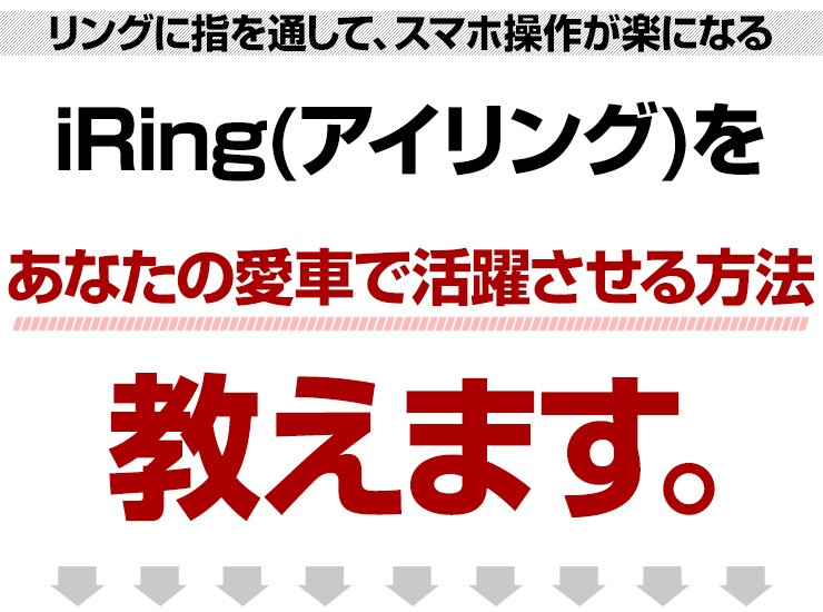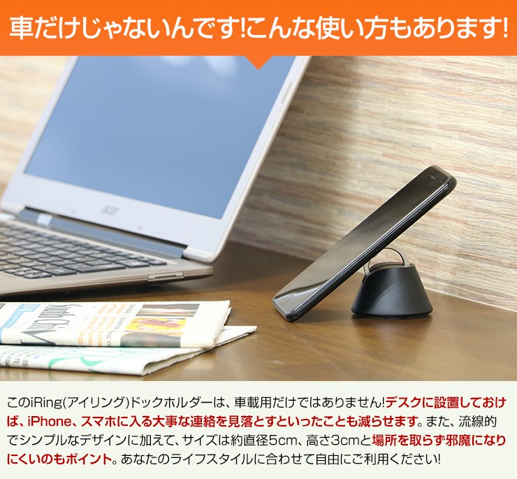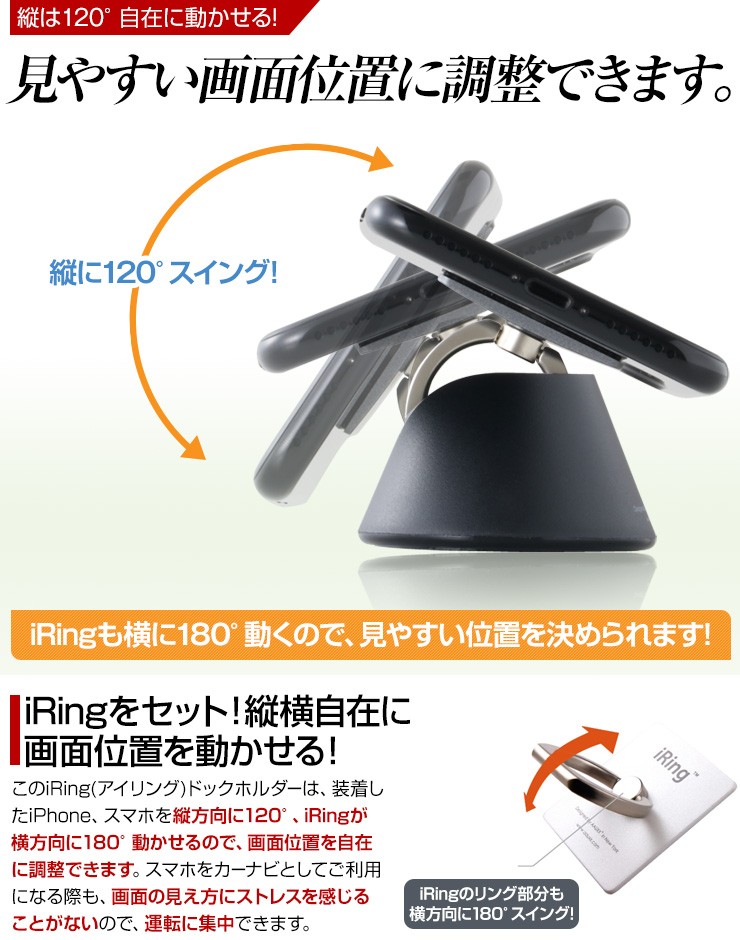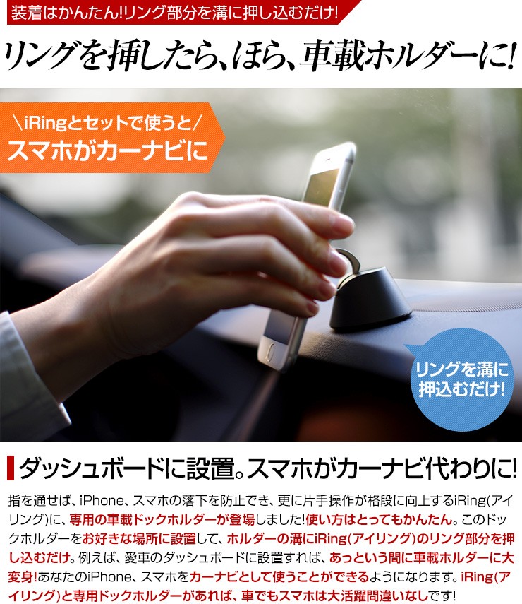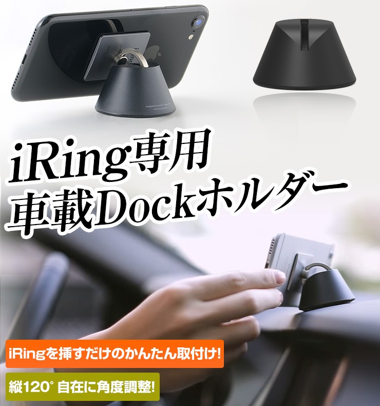 当店で大人気のスマホの落下を防ぎ、片手操作が快適になるiRing(アイリング)をあなたの愛車で活用できる「iRing専用ドックホルダー」入荷しました!iRingを挿し込むだけのかんたん取付けであっという間に車載ホルダーに早変わり!ぜひ、iRing(アイリング)とセットでご利用ください!【製品特徴】●iRing専用の安定したスタンドです。 ●120°角度変更が可能。 ●簡単にiRingをDockホルダーに取り付けができる。 ●耐荷重 500g デジキン