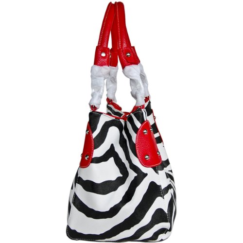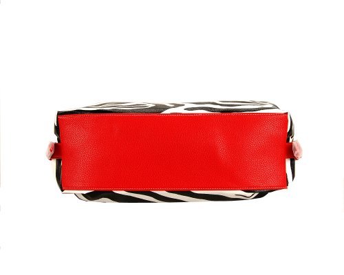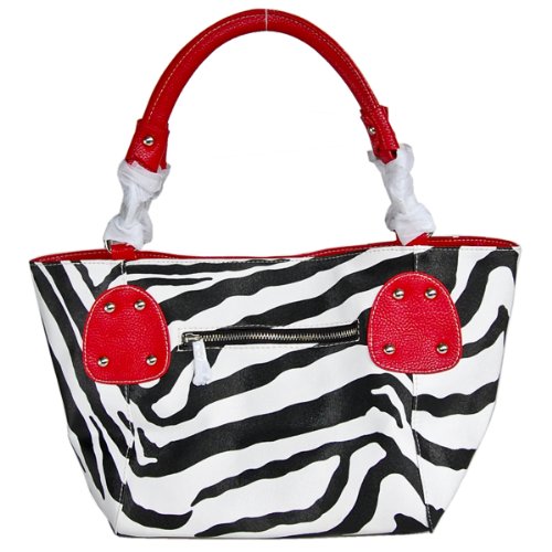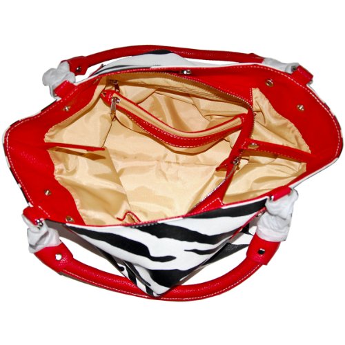 FASH Zebra Stripped Faux Leather Top Zip Tote Office Handbag,Red,One Size