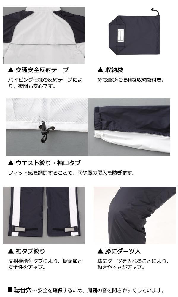 | 透湿素材使用でムレにくく通気性抜群。しかも、メッシュ裏地でサラッと快適です。視野の広がる回転フード仕様で、袖口・ズボン裾のタブで絞りも調節可能です。背中に反射テープが付いておりますので、夜間でも安心です。フードは取り外すことができます。持ち運びに便利な収納袋付き。燃焼の際、有毒なガスを発生しない地球環境にやさしい低公害素材です。 |