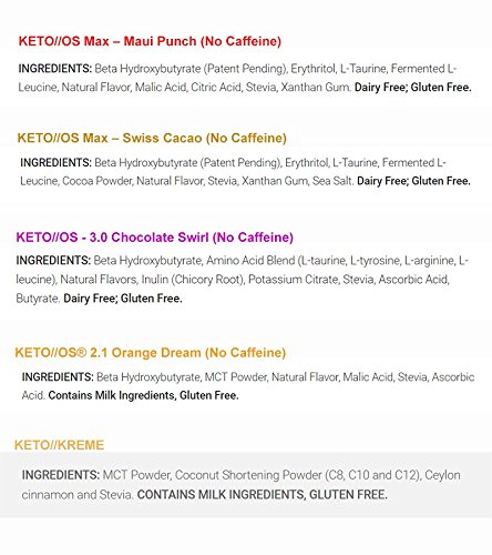 -. Binding : Health and Beauty -. Brand : Pruvit -. Department : unisex-adult -. Feature : A natural, nutritional ketone supplement that gives your body the ketones it needs in order to enter into ketosis and achieve the benefits of ketones via supplementation. / Supplementing with exogenous ketones allows you to experience ketosis. The benefits of elevated blood ketone levels, without having to follow such a restrictive ketogenic diet, or super low carb diet. / Keto OS increases blood ketone levels in the body. Provides fast and sustained energy. / Reduce flu symp like insomnia, fatigue and brain fog. Improved sleep and better mood. -. IsAdultProduct : 0 -. Label : Pruvit -. Manufacturer : Pruvit -. MPN : Pruvit -. PartNumber : Pruvit -. ProductGroup : Health and Beauty -. ProductTypeName : HEALTH_PERSONAL_CARE -. Publisher : Pruvit -. Studio : Pruvit -. Title : KETO//OS Sample Pack - No Caffeine: Max Maui Punch and Swiss Cacao, 3.0 Chocolate Swirl + 2.1 Orange Dream and KREME
