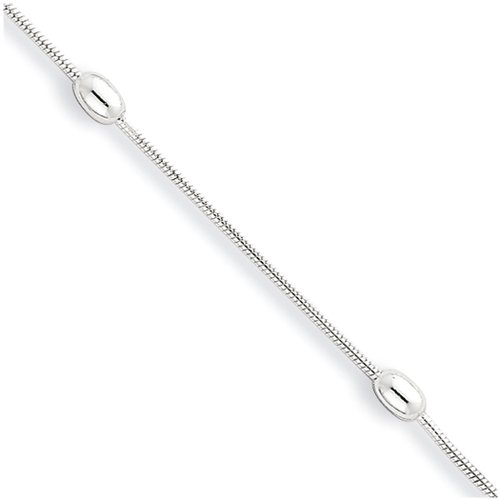 Anklets are a great way to add fun, flash and a feminine touch. This 9-inch ankle bracelet is crafted from polished sterling silver. It features a 1.5mm width round snake style chain with four 4mm width oval bead stations and a lobster claw clasp.Feature