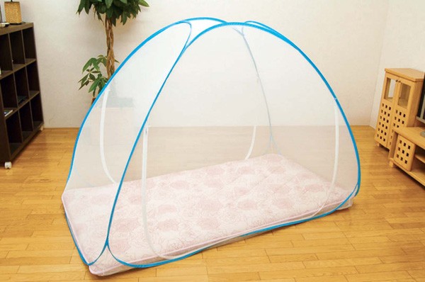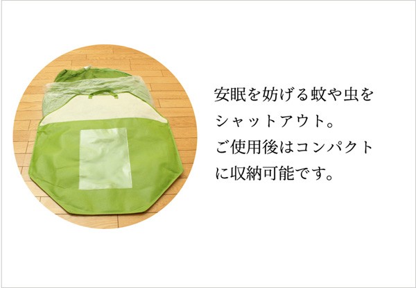 簡単に組み立てる事が出来る蚊帳です。底の部分まで網を張っていますので、完全に蚊の侵入を防ぎお子様を守ります。ベビーベッドの上にもきれいにおさめる事が出来ます。気になるクーラーや扇風機の風も直接当たりません。収納時はコンパクトに折りたためますので、収納スペースを取りません。