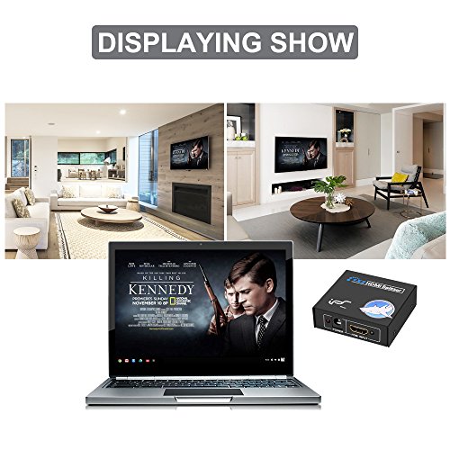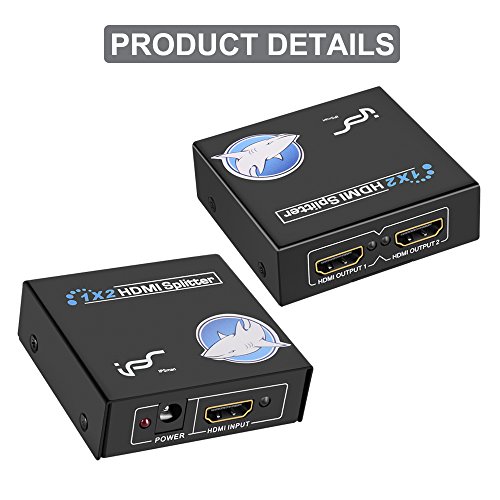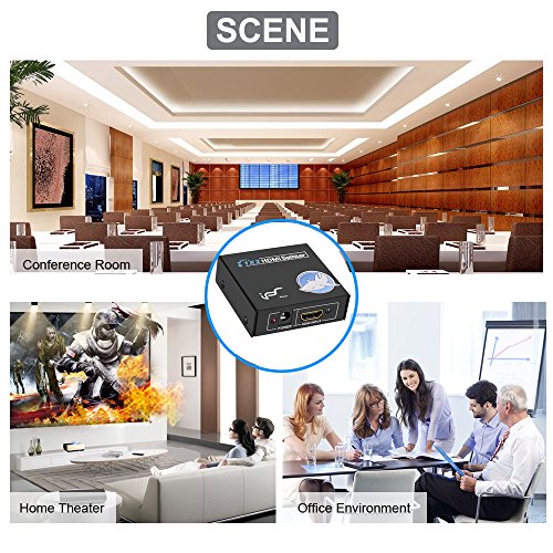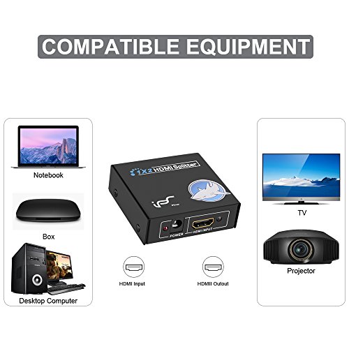 HDMI signal splitter can split your HDMI input devices( PS3, Xbox360,Blu-ray player, Laptop, PC, DVD, TV Box, etc) to 2 HD display output device with HDMI port (Monitor, projector, TV)that you can enjoy the HD video or slides. Plug play. High speed transmission, no signal reduction, excellent image.