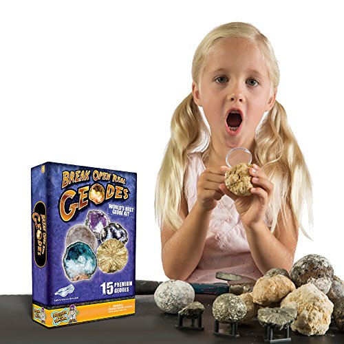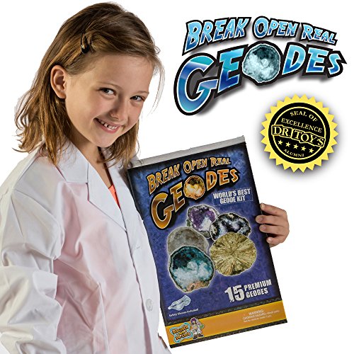 -. Feature : DISCOVER INCREDIBLE CRYSTALS! - Geodes are natural wonders. These hollow rocks have beautiful crystals and minerals inside / ULIMATE VARIETY - Experience 5 different types of geodes and compare a wide variety of crystals formations / CLASSIC FAMILY FUN! - Everyone will love breaking open geodes with this unforgettable STEM science toy / 100% SATISFACTION GUARANTEE - Join the millions of parents who have chosen our award-winning science toys and experience the Discover with Dr. Cool difference! / COMPLETE KID'S SCIENCE KIT - 15 premium-quality geodes, magnifying glass, adventure guide, activity booklet, display stands, and safety goggles