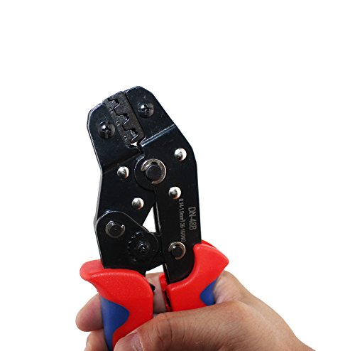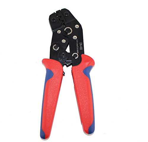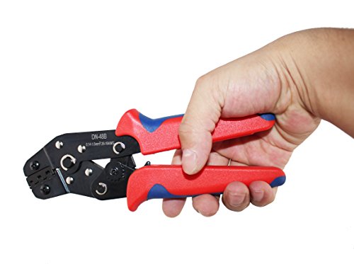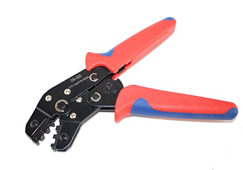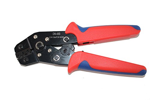 This crimping tool can be used to crimp both male and female crimp pins onto 16-26 AWG wires to make custom cables. The tool offers ratcheting action for increased consistency and ease of use.