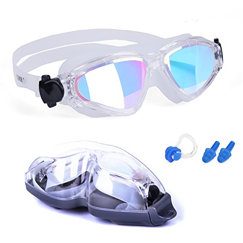 -. Feature : COMFORTABLE FIT: COOLOO High Comfort Swim Goggles provide a sleek and snug fit. Each set includes Swim Goggles featuring Adjustable Head Straps, a Functional Clip and Ear Plugs. Lightweight One Size Goggles fits most people. Suitable for both Adults and Kids / FUNCTIONAL CONSTRUCTION: Leak resistant skirt fit almost every face shape which is able to create a perfect seal, allowing cool water to embrace you without a drip getting in your eyes. The wide panoramic lenses made of Scratch-Resistant polycarbonate offer great freedom of movement, you can hit the blue water whenever and wherever you want / UV 400 ANTI FOG LENSES: Nothing can beat a casual swim under the scorching sun! The goggles features with UV 400 Mirrored Lenses for greater protection against blinding glare and harmful UVA/UVB rays, keeping you safe from the sun. Premium anti fog coating ensure that you have a clear vision to swim without a hint of disturbance / QUICK ADJUSTABLE BUCKLES: Hypo-allergenic silicone double length headstrap with one-touch buckles make adjusting to the goggles more easily and quickly. Innovative Anti-skid Design on the middle of the headstrap offers a high level of security and stability / PACKAGE & GUARANTEE: Each package includes: Swim Goggles x 1, Carrying Case x 1, Nose Clip x 1, Ear Plug x 1 pair. COOLOO provides 12-Month Warranty for every customer that purchased our products. No more worry about the quality! If there is anything wrong with our products, please feel free to contact us via Email. We will solve the problem as soon as possible
