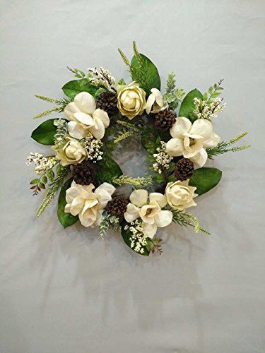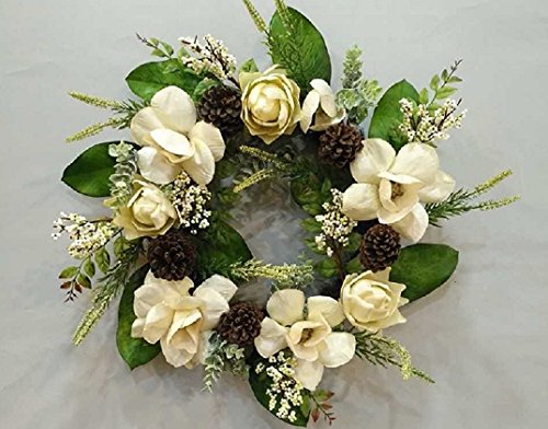 - CHRISTMAS AND WINTER HOLIDAY DECOR Magnolia Wreath Christmas Wreath or Winter Front Door Filled with artificial silk Magnolias in various stages of opening, berries, pine cones, and a mixture of various greens, this decorative wreath is a perfect seasonal accent when hung in a kitchen, living room, or above a fireplace.