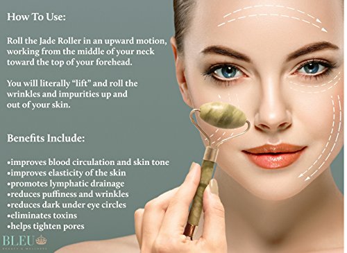 Your Skin is Ready to Look as Young as You Feel with Bleu Beauty's Premium Jade Facial Roller!Instructions For Use: Roll the Jade Roller in an upward motion, working from the middle of your neck toward the top of your forehead. Bleu Beauty's Jade rollers can be used daily for that fresh-from-the-spa feeling in the comfort of your home! You will literally "lift" and roll the wrinkles and impurities up and out of your skin.