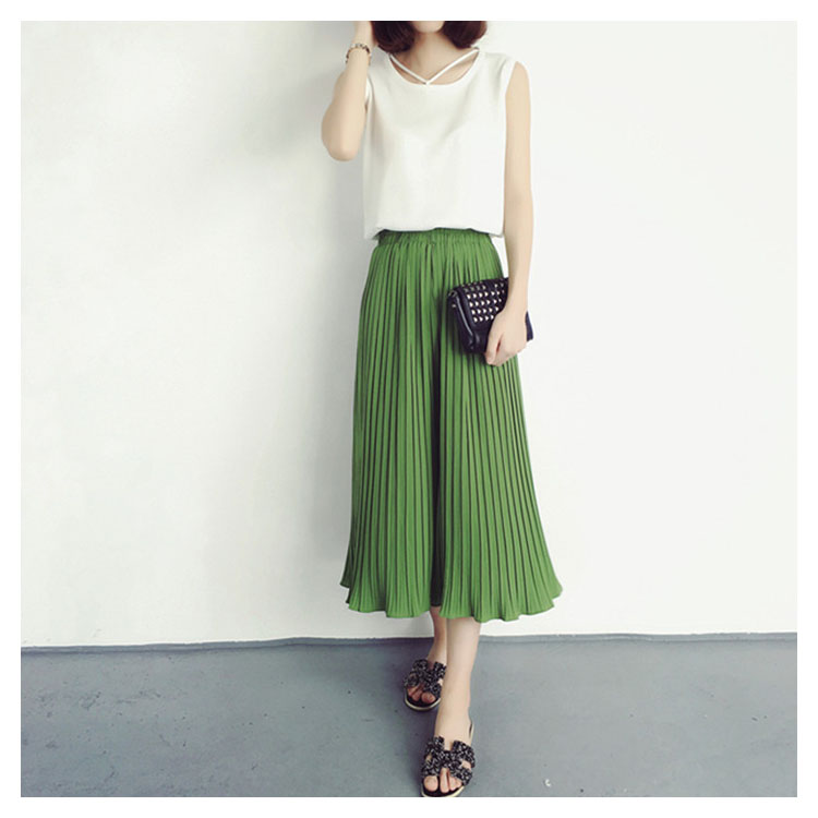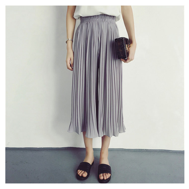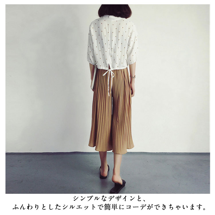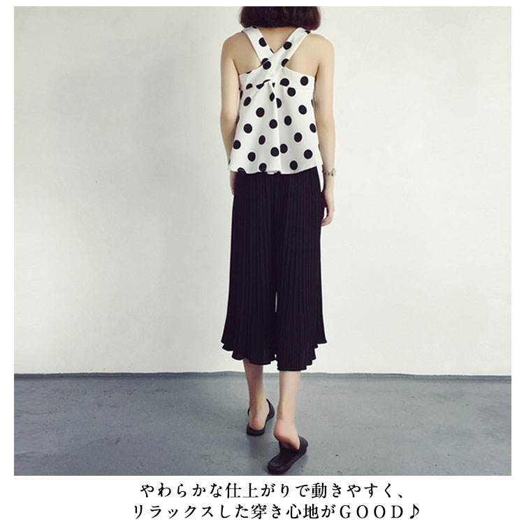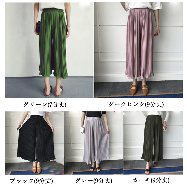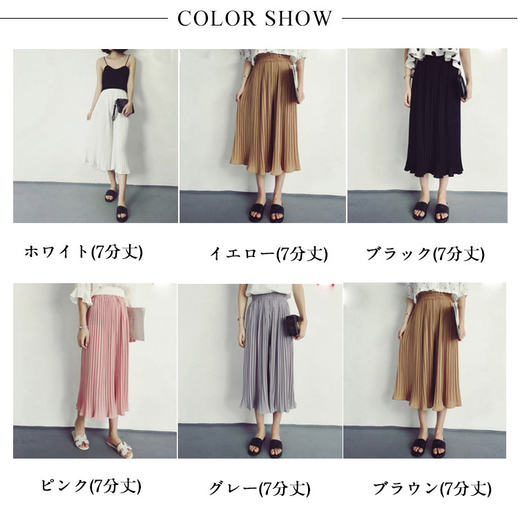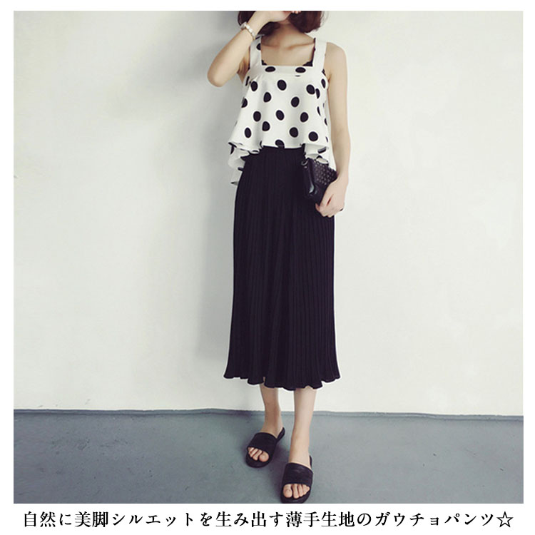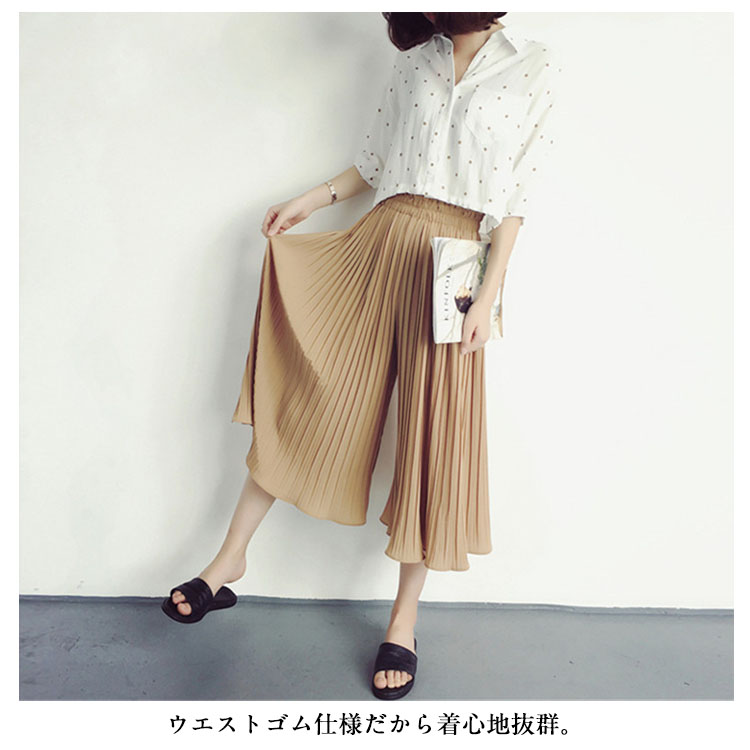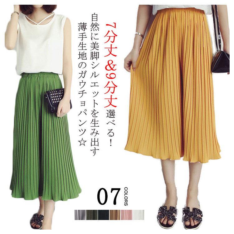 | 7分丈&9分丈選べる!自然に美脚シルエットを生み出す薄手生地のガウチョパンツ☆やわらかな仕上がりで動きやすく、リラックスした穿き心地がGOOD♪プリーツのラインが自然に美脚ラインを作り脚長効果もばっちり!ウエストゴム仕様だから着心地抜群。シンプルなデザインと、ふんわりとしたシルエットで簡単にコーデができちゃいます。 | |