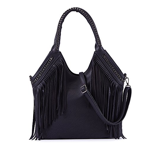 -. Brand : Celaine -. Department : womens -. Feature : Hand Manufactured Using Premium Faux Suede Leather Material / Beautiful Vintage Tassel Suede Leather Design Look / Zipper Closure with Lots of Room to Store Purse, Wallet, Makeup, Phone and other essentials / Outer and Inner Zipper Compartment. Includes Hand and Shoulder Straps. / Dimensions: 15 x 10 x 6 Inch -. ProductGroup : Shoes -. ProductTypeName : HANDBAG -. Title : Celaine Womens Handbags Tassel Cross Body Shoulder Bag Hobo Satchel - Large Storage - PU Suede Leather, Black