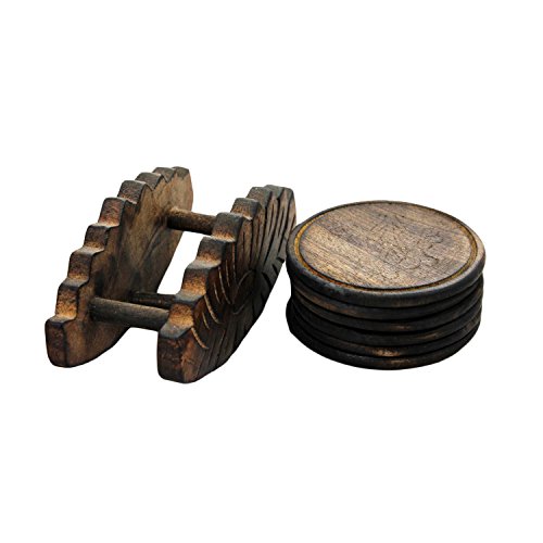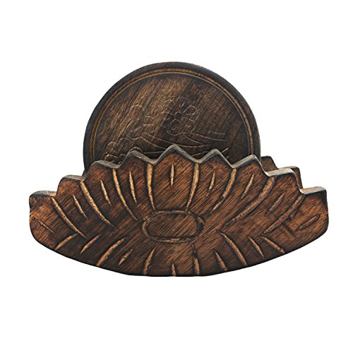Gifts From India- Hand Carved Set of 6 Wooden Coasters in a Flower Shaped Holder, Ideal for Home, office Bar Dinning Accessories Stand Size : 5.5"x4"x3.75" Coaster Size : 3"x3"