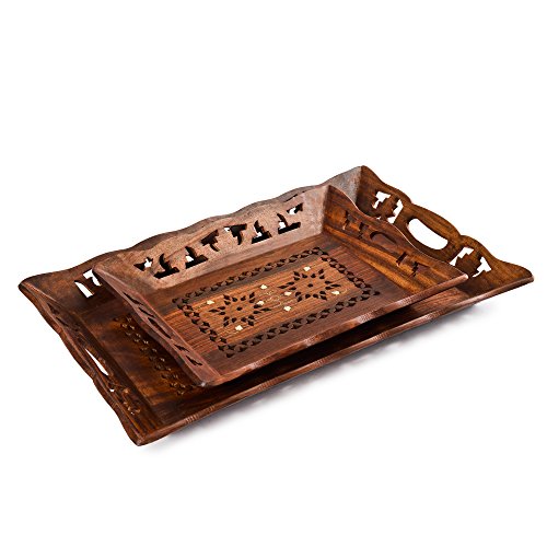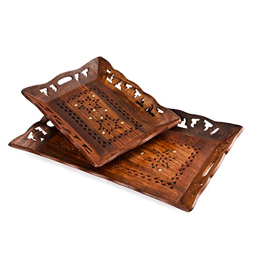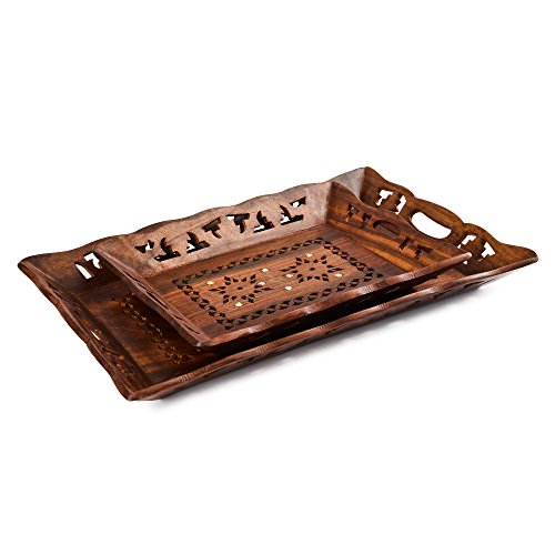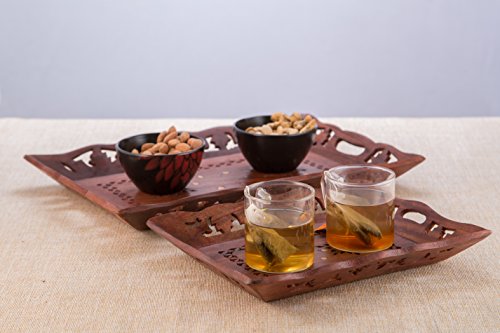 This handcrafted tray is made of high quality Indian rosewood which is stronger, resistant to decay and termites. This natural tray has food-grade finish with no artificial polish. Dimensions of the trays included in this set are 15''x10'' and 10''x8''.