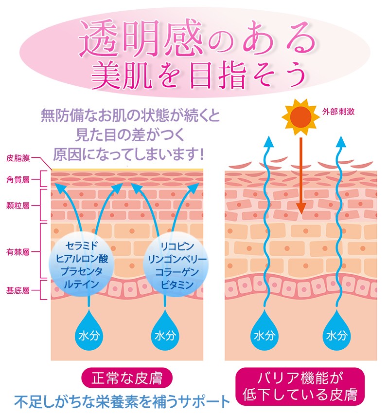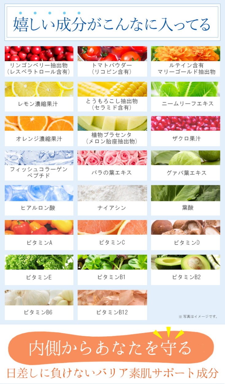 | 成分 | リンゴンベリー抽出物(レスベラトロール含有)、ルテイン含有マリーゴールド抽出物、ニームリーフエキス末、とうもろこし抽出物(セラミド含有)、レモン果汁パウダー(レモン濃縮果汁、デキストリン、澱粉)、フィッシュコラーゲンペプチド(ゼラチンを含む)、バラの葉エキス末、植物プラセンタ(メロン胎座抽出物、デキストリン)、トマトパウダー(リコピン含有)、グァバ葉エキス末、オレンジ果汁末(オレンジ濃縮果汁末、デキストリン、温州みかん濃縮果汁)、デキストリン、ザクロ果汁/セルロース、ステアリン酸カルシウム、微粒酸化ケイ素、ヒアルロン酸、ビタミンC、ビタミンE、ナイアシン、パントテン酸Ca、ビタミンB2、ビタミンB1、ビタミンB6、ビタミンA、葉酸、ビタミンD、ビタミンB12 |