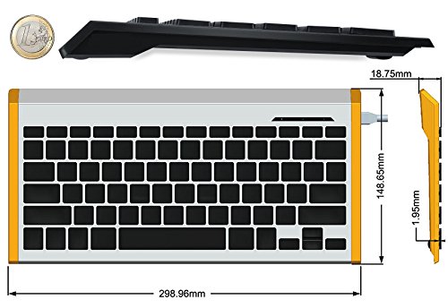 -. Feature : Bluetooth 3.0 Technology with up to 30ft Operating Range - Support HID (Human Interface Device) / 10"x5" Portable Size / Rechargeable Li-ion Battery with On/Off Switch / Silent X Type Scissor Keys - Non-slip Rubber Feet / Support Windows, iOS & Android 3.0 and Up Operating System - Mapping with Windows Layout