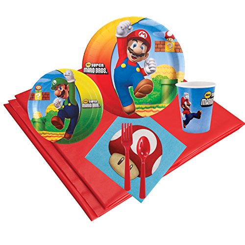 -. Feature : Includes (8) paper dinner plates, (8) paper dessert plates, (8) 9 oz. paper cups, (16) 2-ply paper lunch napkins, (8) sets of plastic forks and spoons, and (1) plastic tablecover. / Add matching tableware, favors, accessories, or a party kit bundle to complete your Mario Brothers birthday party. / Features classic Nintendo characters such as Mario and Luigi!