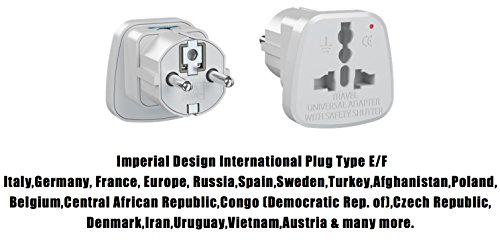 Imperial Design® Plug Type E/F: Italy,Germany, France, Europe, Russia,Spain,Sweden,Turkey,Afghanistan,Poland, Belgium,Central African Republic,Congo (Democratic Rep. of),Czech Republic, Denmark,Iran,Uruguay,Vietnam,Austria & many more.