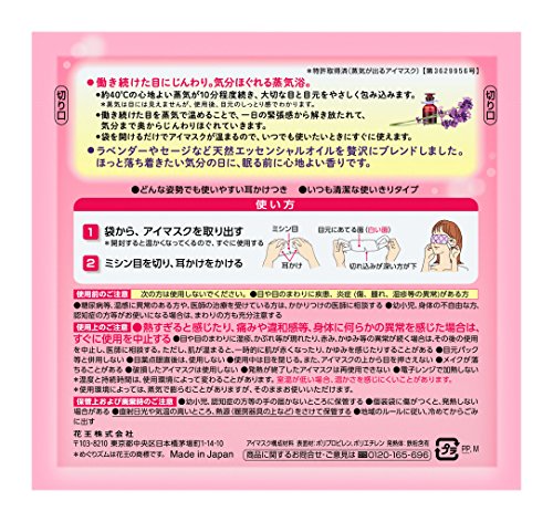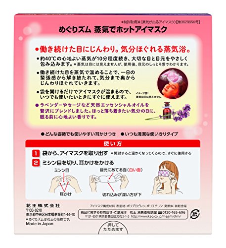 -. Binding : Health and Beauty -. Brand : KAO -. EAN : 4901301245502 -. Feature : 14 sheets sheet is one box / 14 sheets sheets is not 14 boxes -. IsAdultProduct : 0 -. Label : Kao -. Manufacturer : Kao -. MPN : 245502 -. PackageQuantity : 1 -. PartNumber : 245502 -. ProductGroup : Health and Beauty -. ProductTypeName : HEALTH_PERSONAL_CARE -. Publisher : Kao -. Studio : Kao -. Title : Kao MEGURISM | Health Care | Steam Warm Eye Mask Lavender Sage x 14