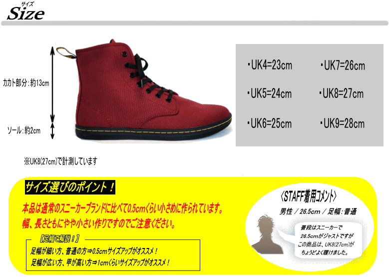 | 商品説明 | <BRAND STORY> 当初はワークブーツとしての用途が中心でしたが、スキンヘッズが目をつけ始めた事からミュージシャンの愛用者も増え始め,ビートルズ、ローリングストーンズなどの世界的アーティストに使用されることにより、ドクターマーチンは空前の大ブームとなりました。その後もパンクス・ロッカーズの定番として、ストリートカルチャーと密接に結びついたスタイルで絶大な支持を受けるなど、ファッションに欠かせない重要アイテムとして不動の地位を築いています。 <ITEM INFO> ・キャンバスアッパーを使用した7アイレットのスニーカータイプ。 ・定番1460を思わせるスタイルで、快適なフィット感を得られるカップインソールで履き心地もよく、オールシーズン履けるシンプルなキャンバススニーカーブーツです。 ・イエローステッチ等ドクターマーチンらしさはしっかり健在。 ・日本国内でのメンズサイズは、通常"ALFIE(8ホール)"というモデルとなっており、こちらの"SHOREDITCH(7ホール)"での、メンズサイズ展開は、非常にレアになります!! |