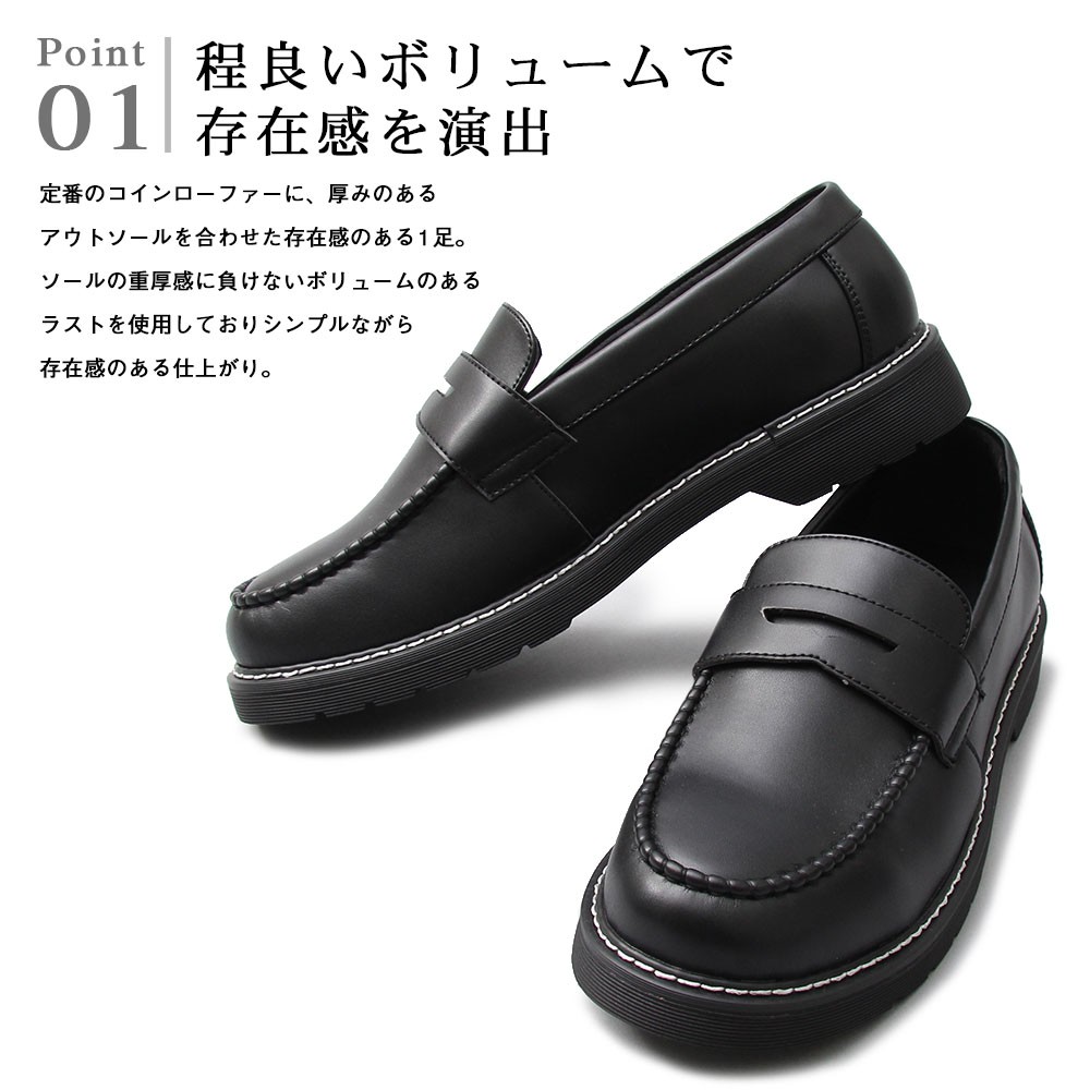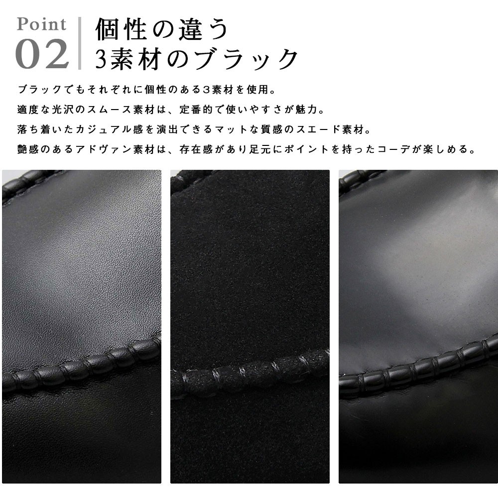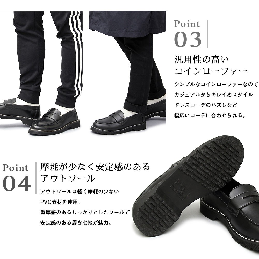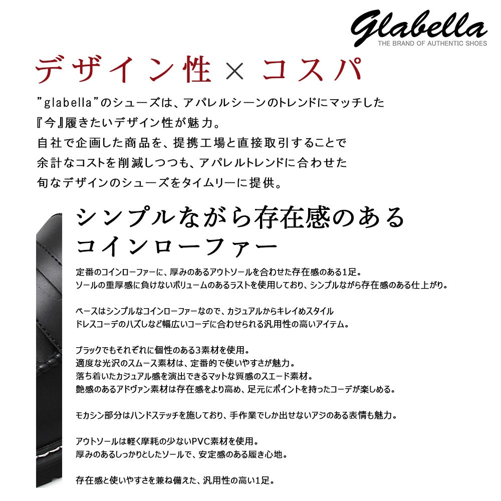 | 商品説明 | ”シンプルながら存在感のあるコインローファー” 定番のコインローファーに、厚みのあるアウトソールを合わせた存在感のある1足。 ソールの重厚感に負けないボリューム感のあるラストを使用しており、 シンプルながら存在感のある仕上がり。 ベースはシンプルなコインローファーなので、カジュアルからキレイめスタイル、 ドレスコーデのハズしなど幅広いコーデに合わせられる汎用性の高いアイテム。 ブラックでもそれぞれに個性のある3素材を使用。 適度な光沢のスムース素材は、定番的で使いやすさが魅力。 落ち着いたカジュアル感を演出できるマットな質感のスエード素材。 艶感のあるアドヴァン素材は存在感をより高め、足元にポイントを持ったコーデが楽しめる。 モカシン部分はハンドステッチを施しており、手作業でしか出せないアジのある表情も魅力。 アウトソールは軽く摩耗の少ないPVC素材を使用。 厚みのあるしっかりとしたソールで、安定感のある履き心地。 存在感と使いやすさを兼ね備えた、汎用性の高い1足。 |