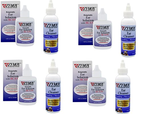 -. Binding : Misc. -. Brand : Zymox -. EAN : 0600166910450 -. Feature : Nontoxic way to clean and protect dirty ears / Doesn't contain harsh chemicals or cleaners to irritate sensitive ears / Contains Lacoperoxidase, Lactoferrin and Lysozyme, which have natural bio-active properties to gently clean non-infected ears / Leaves ears smelling fresh / Inhibits bacterial growth -. Label : Pet King Brands -. Manufacturer : Pet King Brands -. PackageQuantity : 1 -. ProductGroup : Pet Products -. ProductTypeName : PET_SUPPLIES -. Publisher : Pet King Brands -. Studio : Pet King Brands -. Title : Zymox Otic Dog Pet Cat Ear Treatment 1.25 oz and Ear Cleanser 4 oz - 4 Combo Packs -. UPC : 600166910450