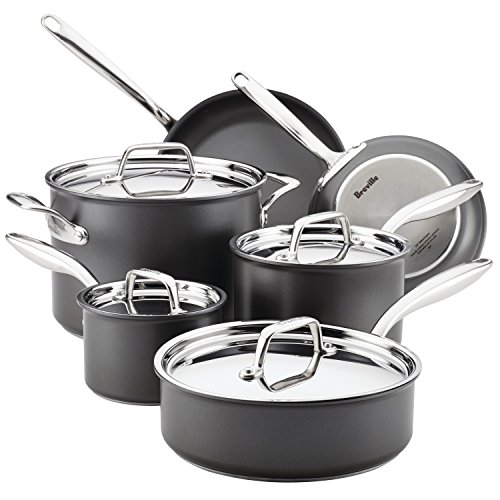 Get premium-quality hard-anodized cookware that conducts and holds heat throughout the cooking process, with the Breville Thermal Pro Hard-Anodized Nonstick 10-Piece Cookware Set. Superior heating and cooking performance built to last: that's Breville Thermal Pro Hard-Anodized Cookware. This exceptional cookware features durable hard-anodized aluminum construction that efficiently distributes heat, and the impact-bonded, warp-resistant pan base controls temperature fluctuation even as ingredients are added and removed. Cookware form follows function with curved interior profiles to enable full utensil access around the stockpot, saucepan and sauté bases and make cleaning easier. Triple-layer nonstick inside and out delivers exceptional food release, and is metal utensil and dishwasher safe. Distinctively flared rims on all the pots and pans enable drip-free pouring. The Thermal Pro 10-Piece Cookware Set from Breville is engineered to conduct, control and retain heat from base to walls, whatever the cooking process. Whether the filet of choice is fresh salmon, grass-fed beef or free-range chicken, whether the process is gently warming almond milk or frying a farm-fresh egg to order, the induction-suitable cookware cooks, sears, simmers and browns beautifully. Breville cookware features ergonomic cast stainless steel handles that are seamlessly dual-riveted to keep pan interiors cleaner and contoured for control and comfort. Deep-seated mirror-polished stainless steel lids seal in heat and moisture with a sleek stovetop look. Oven safe to 500 Degree, this premium-quality cookware set is built and guaranteed for life. Flavor-building and meal-making from simple to sophisticated - food's full array of cooking possibilities is optimized with the durable, all-range Breville Thermal Pro Hard-Anodized Nonstick 10-Piece Cookware Set.Feature