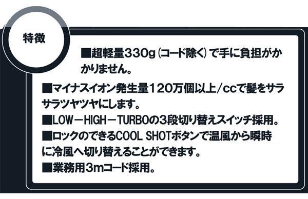 本体重量超軽量の330gで手に負担がかかりません。マイナスイオンで髪をサラツヤにします。スイッチは「LOW-HIGH-TURBO」の3段階切り替え。ロックのできるCOOL SHOTボタンで温風から瞬時に冷風へ切り替えることができます。 |