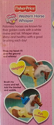 Studio : Fisher-Price Publisher : Fisher-Price Binding : Toy Product Description Fisher-Price Loving Family Western Horse Whisper is a Palomino horse. Palomino horses are known for their golden coats with a white mane and tail. Whisper stays shiny and healthy with a good brushing each day! Press her head and she will paw the ground and whinny! Brush her mane and tail, then add the blanket and saddle. Great for playing with the (sold separately) Loving Family dollhouse! 0
