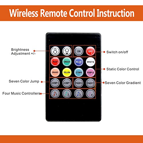 MUSIC SOUND BEAT LED STRIP LIGHT - These Premium Car LED Light Strips comes with a wireless remote control you can use to switch between different LED Modes and adjust brightness as you wish. Enjoy the cool color changing effect dancing to the rhythm of your stereo music with the built-in Sound Active Function.