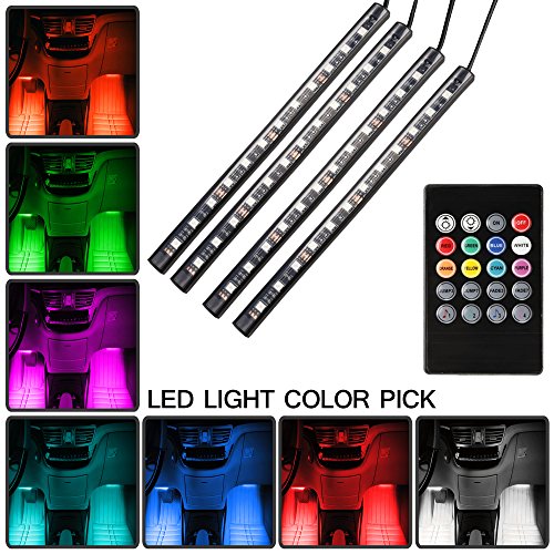 Car LED Strip Lights, Top Notch 4 Pieces Multi-Color Car RGB LED Light Strip Under Dash Lighting Kit Music Car Interior Decorative Accent Lights w/ Sound Active Function Remote Control, DC 12V