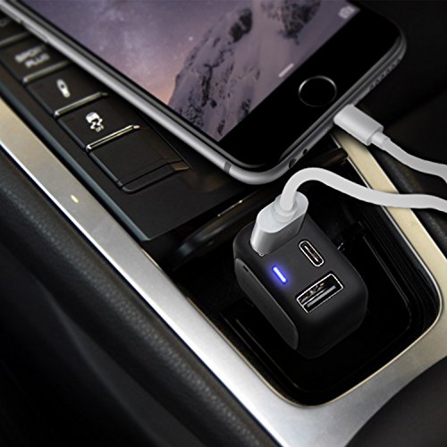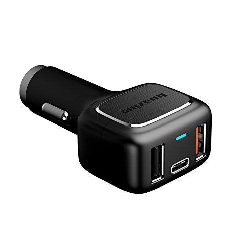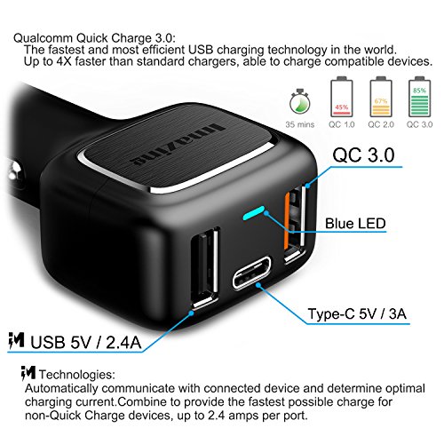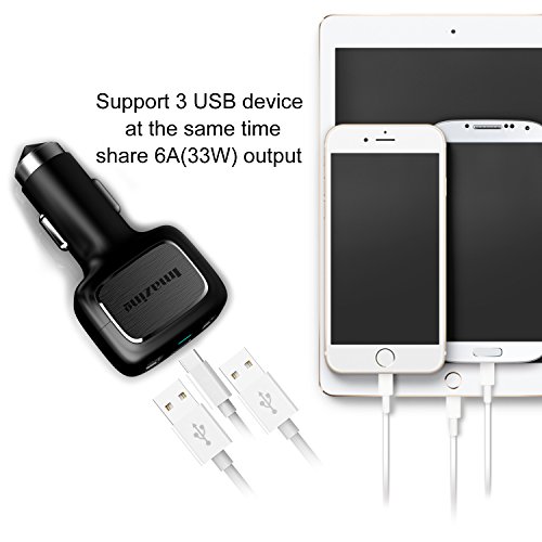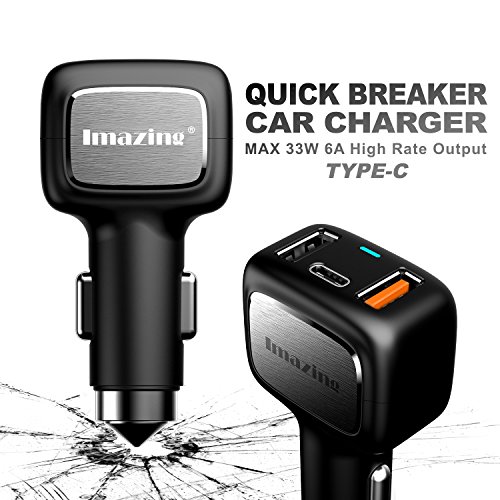 [Qualcomm Certified] 3-port Car Charger Qualcomm Quick Charge 3.0 USB , Type-C [USB-C], Total 33W 6A for Samsung, iPhone, iPad, LG, Nexus, HTC and MacBook More Emergency Car Window Hammer …