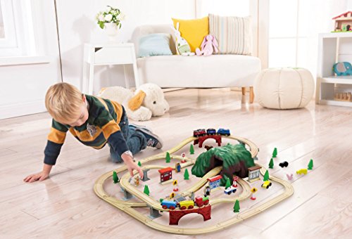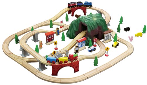 This 100 piece Mountain Wooden Train Set is another exciting wooden train set. There's so much to do in this bustling mountain town. Chug up the mountain pass and wind down the other side, over the bridges, through a tunnel and past villages, forests and townspeople. With 100 pieces in this amazing wooden train set, it's sure to bring hour after hour of family-friendly fun for your little engineer.Feature